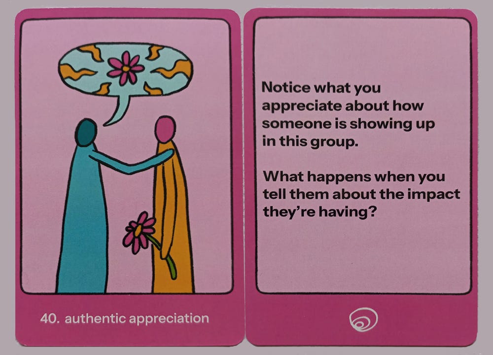 I’m bringing this card because it feels aligned with the spirit of the season, and because most of us could benefit from strengthening our appreciation muscles. I’m curious to see what happens when I consciously offer genuine appreciation in a group setting (especially outside of the MiSo lingo). How does the energy shift? How do different people respond? And where’s the line between just enough and overdone? I’m in for some fun holiday experiment.